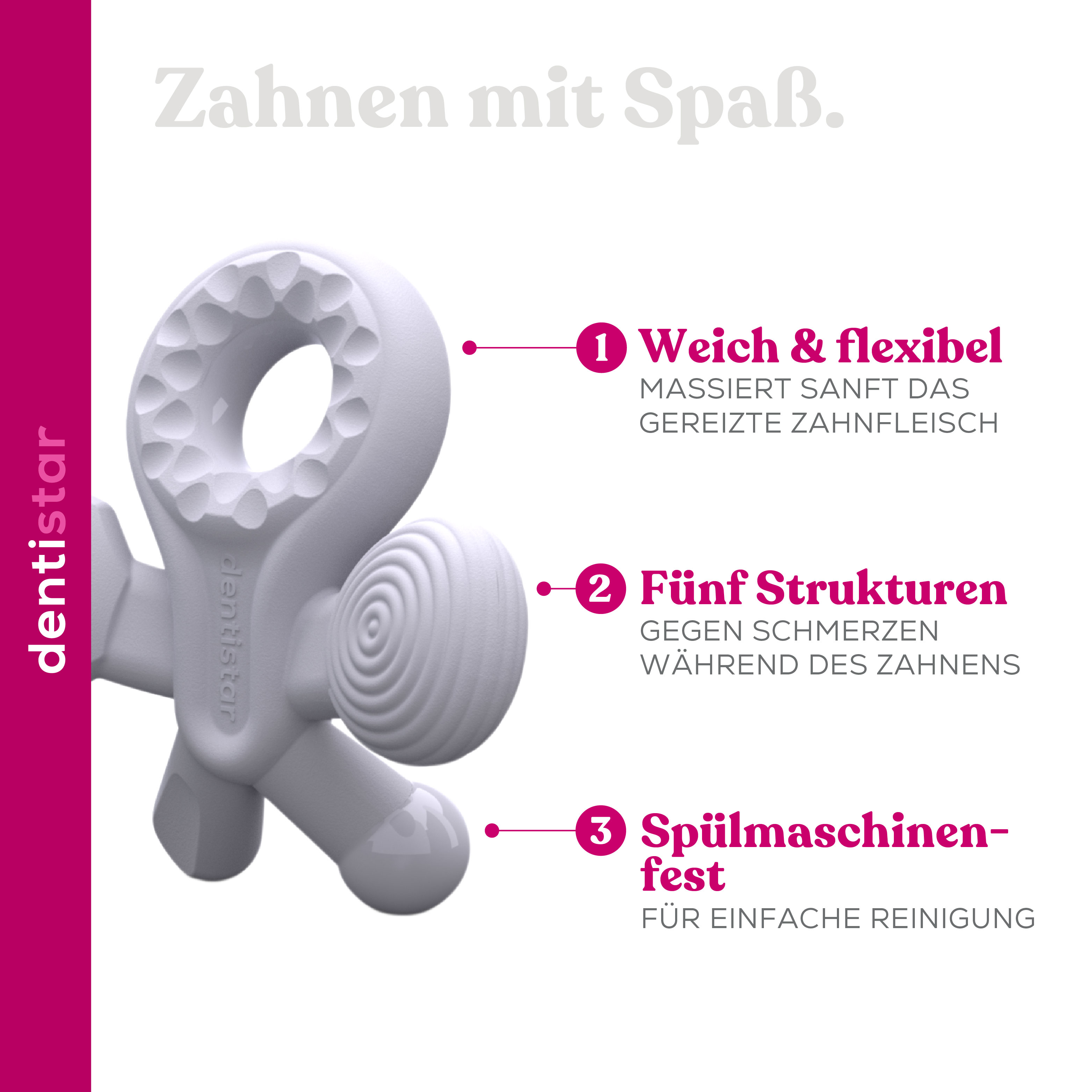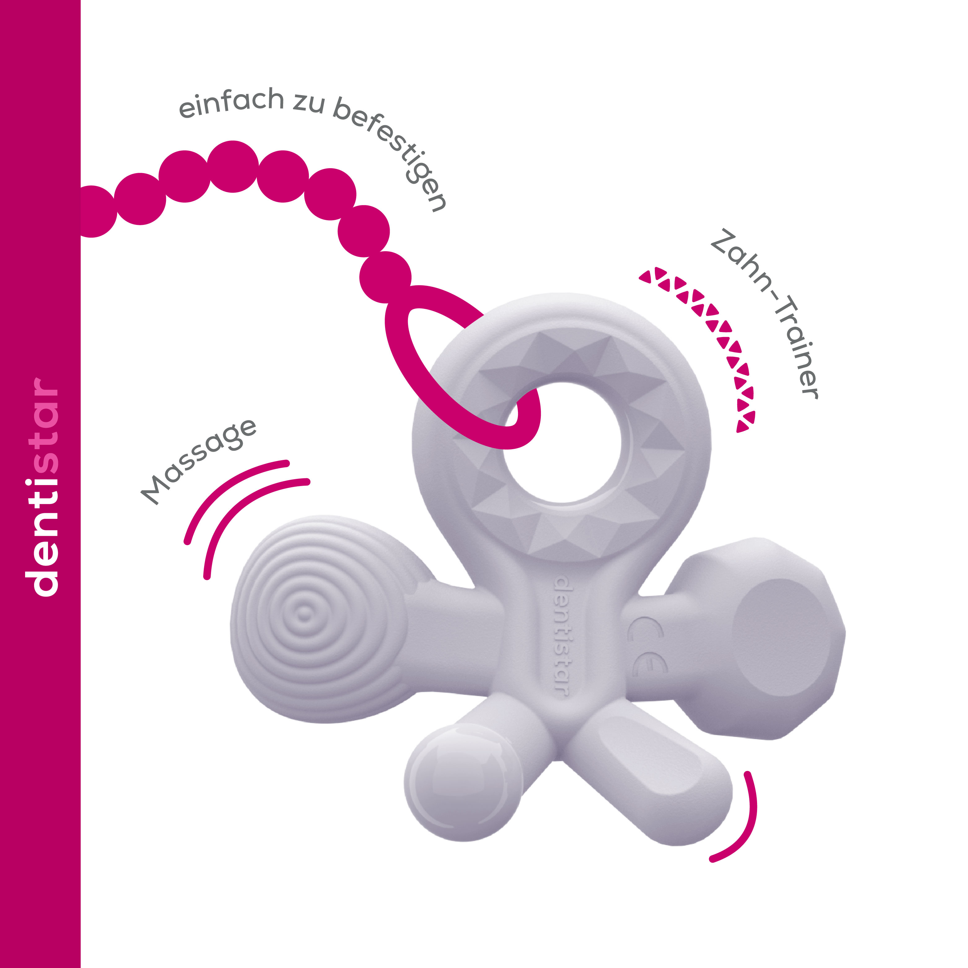 The dentistar star teether gently massages the gum. Pain is alleviated before and during teething. The five different surface areas of the teether make it fun to chew.